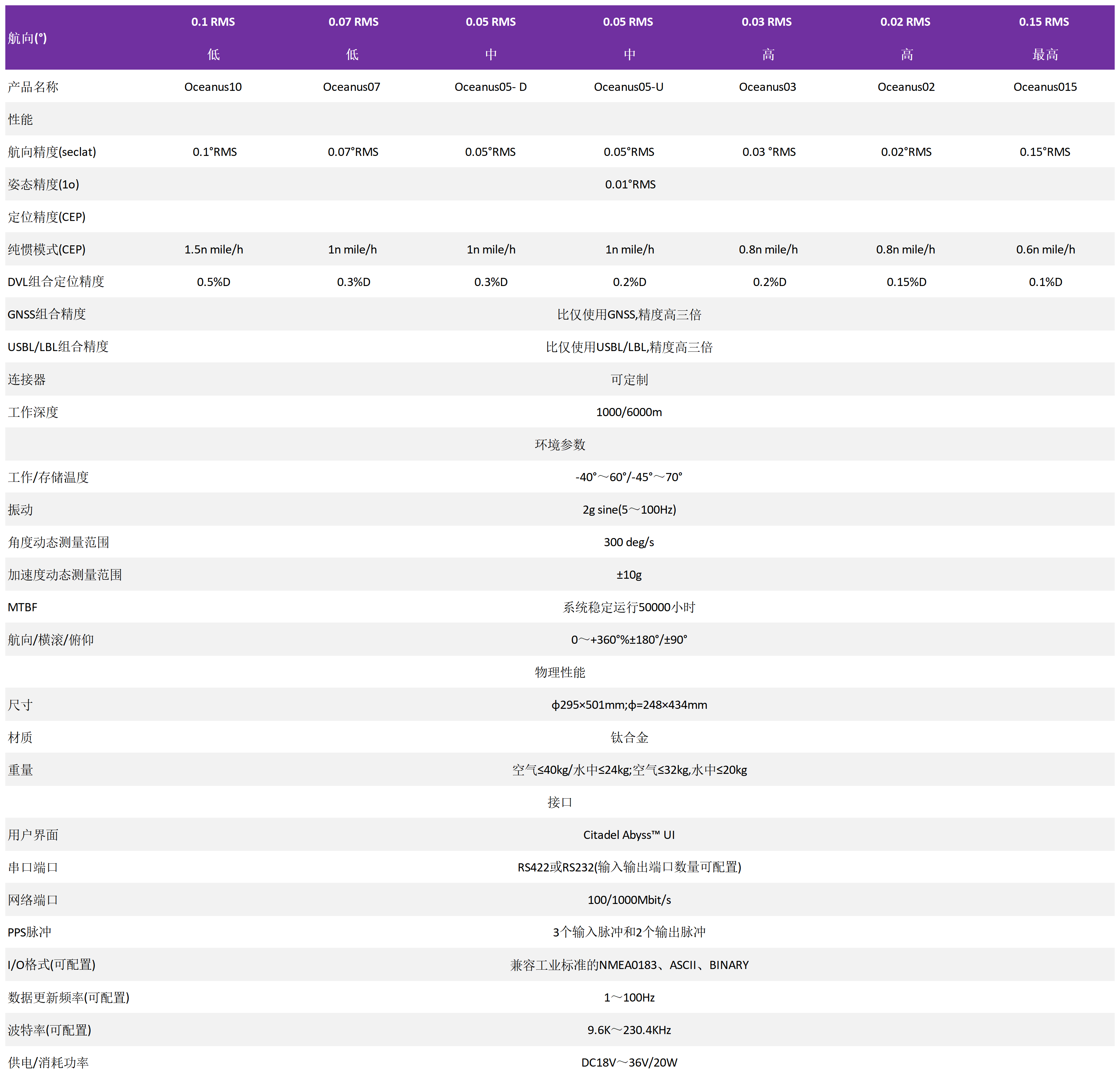 高精度惯导性能:姿态精度最高可达0.015RMS。在DVL辅助下位置误差<0.1%D